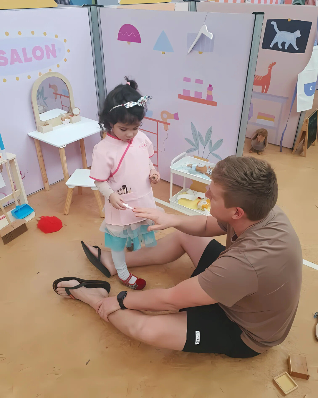 No chairs (except for snacks & rests): We limit chairs, except for snack breaks, to encourage parents to join role play, fostering family bonds.